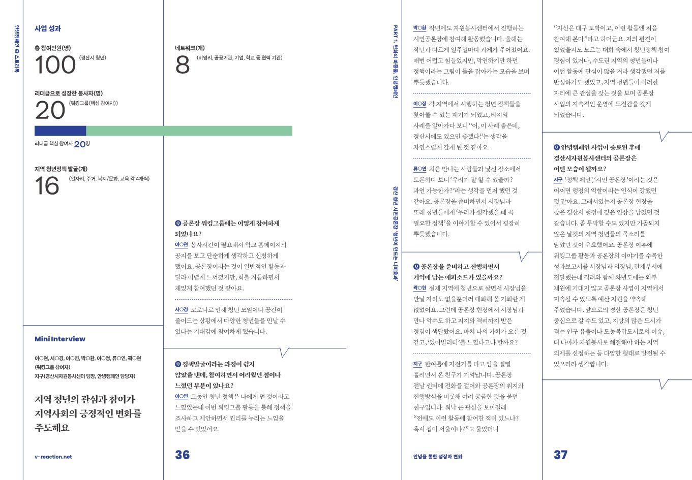 임팩트 스토리 [안녕캠페인] 청년 시민공론장 ‘청년이 만드는 나비효과’ 관리자 2022.11.17 521 이전글 [안녕캠페인] 다 같이 행복~ 동네 만들기 목록 다음글 [안녕캠페인] 주민주도적 안전마을 만들기 사업 ‘사랑을 나누는 主(주)輳(주) 이웃돌봄마을’