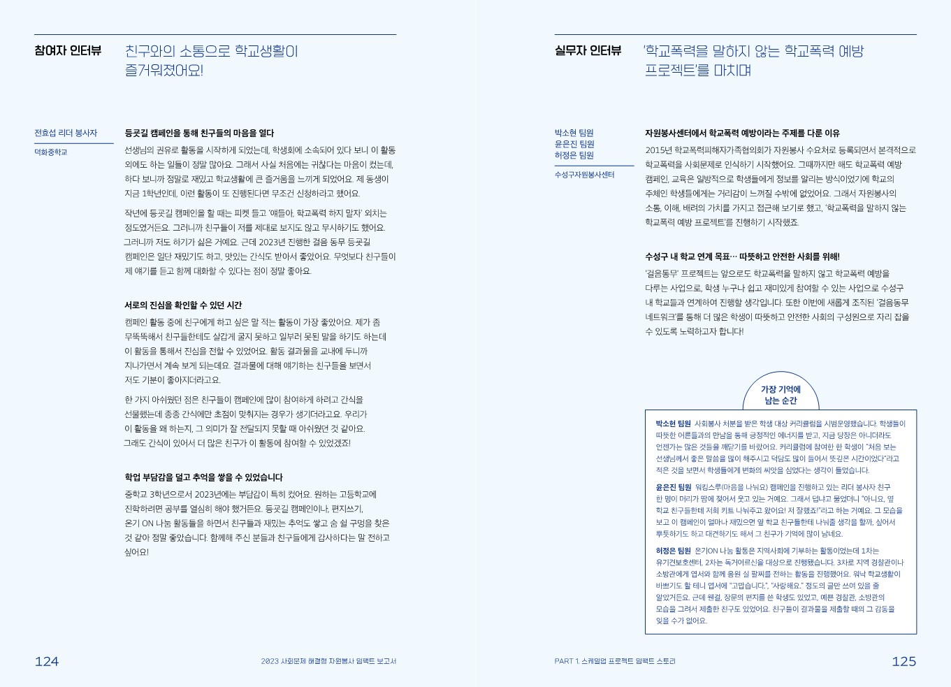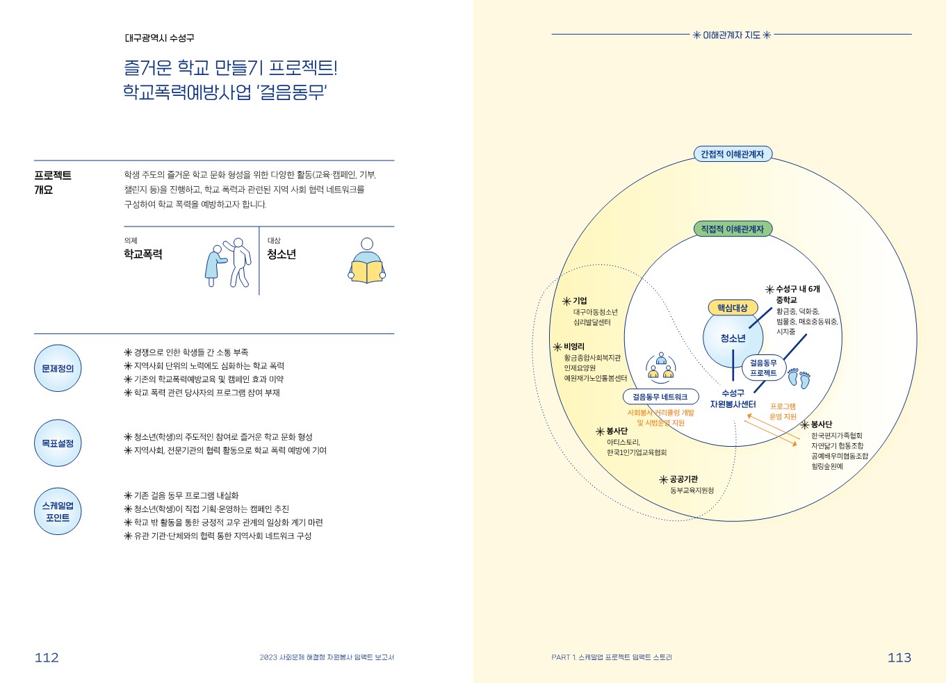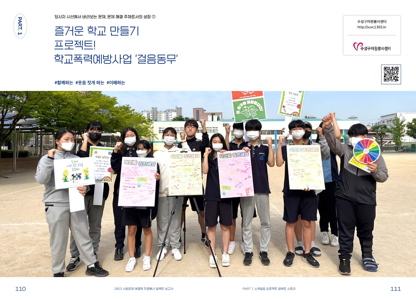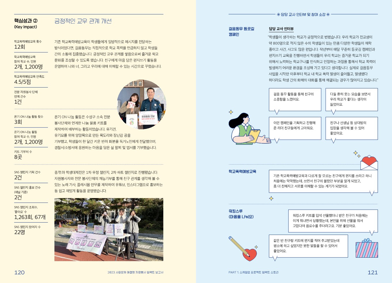 임팩트 스토리 [스케일업 프로젝트] 즐거운 학교 만들기 프로젝트! 학교 폭력 예방 사업 ‘걸음 동무’ 관리자 2024.02.08 449 이전글 [스케일업 프로젝트] 대학가 쓰레기 불법투기 개선을 위한 청년들아, 치워랍(Cheer up)! 목록 다음글 [스케일업 프로젝트] 주민 주도적 안전마을 조성 사업 '마을을, 잇(it)다(all)' : 연결하다