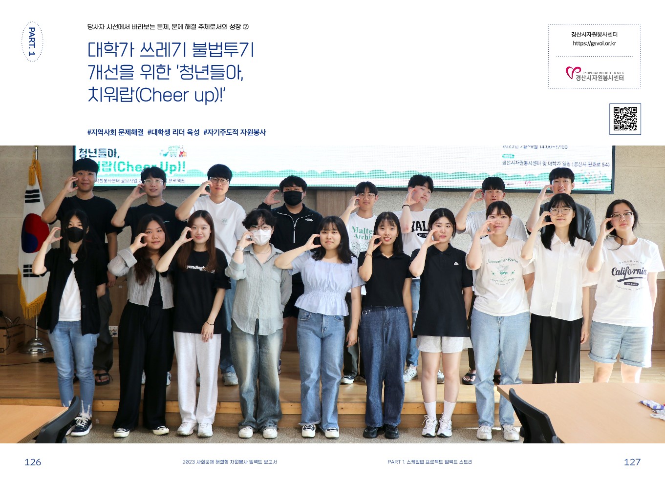 임팩트 스토리 [스케일업 프로젝트] 대학가 쓰레기 불법투기 개선을 위한 청년들아, 치워랍(Cheer up)! 관리자 2024.02.08 475 이전글 [스케일업 프로젝트] 에너지 드림 이(Environment) 순(Social) 간(Governance) 목록 다음글 [스케일업 프로젝트] 즐거운 학교 만들기 프로젝트! 학교 폭력 예방 사업 ‘걸음 동무’