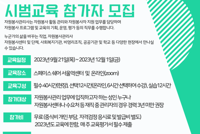 [홍보] 자원봉사관리사 2급 시범교육 참가자 모집 안내