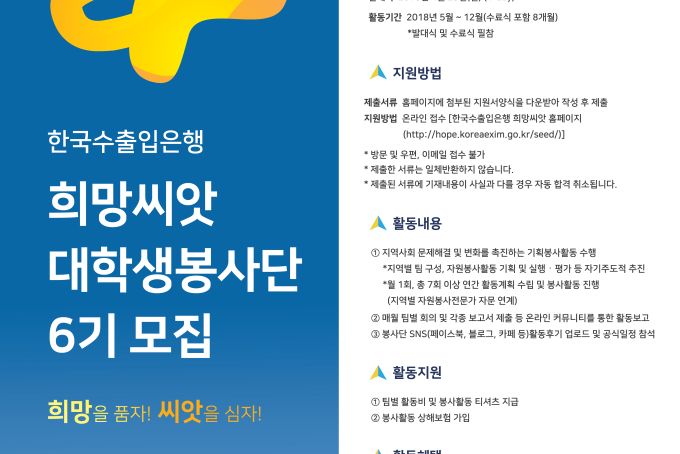 [홍보] (사)한국자원봉사문화와 한국수출입은행이 함께하는 희망씨앗 대학생 봉사단 6기 모집