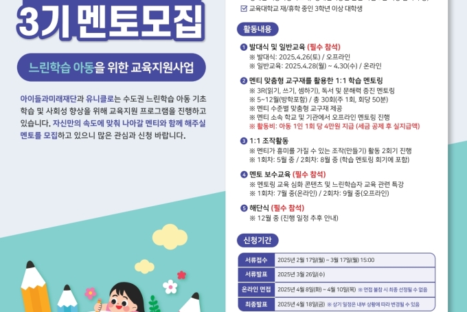 [모집] 느린학습 아동 교육지원사업 '천천히 함께' 멘토 모집 안내