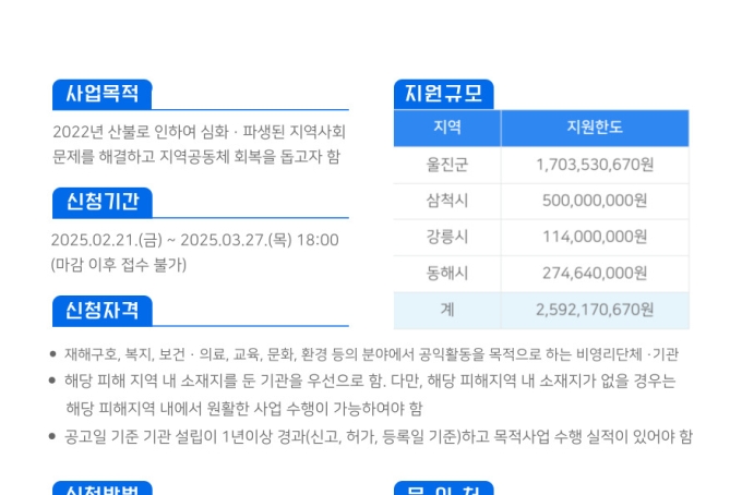 [모집] 희망브리지 전국재해구호협회, 2022년 경북·강원 산불 지역회복지원 3차 공모사업 안내
