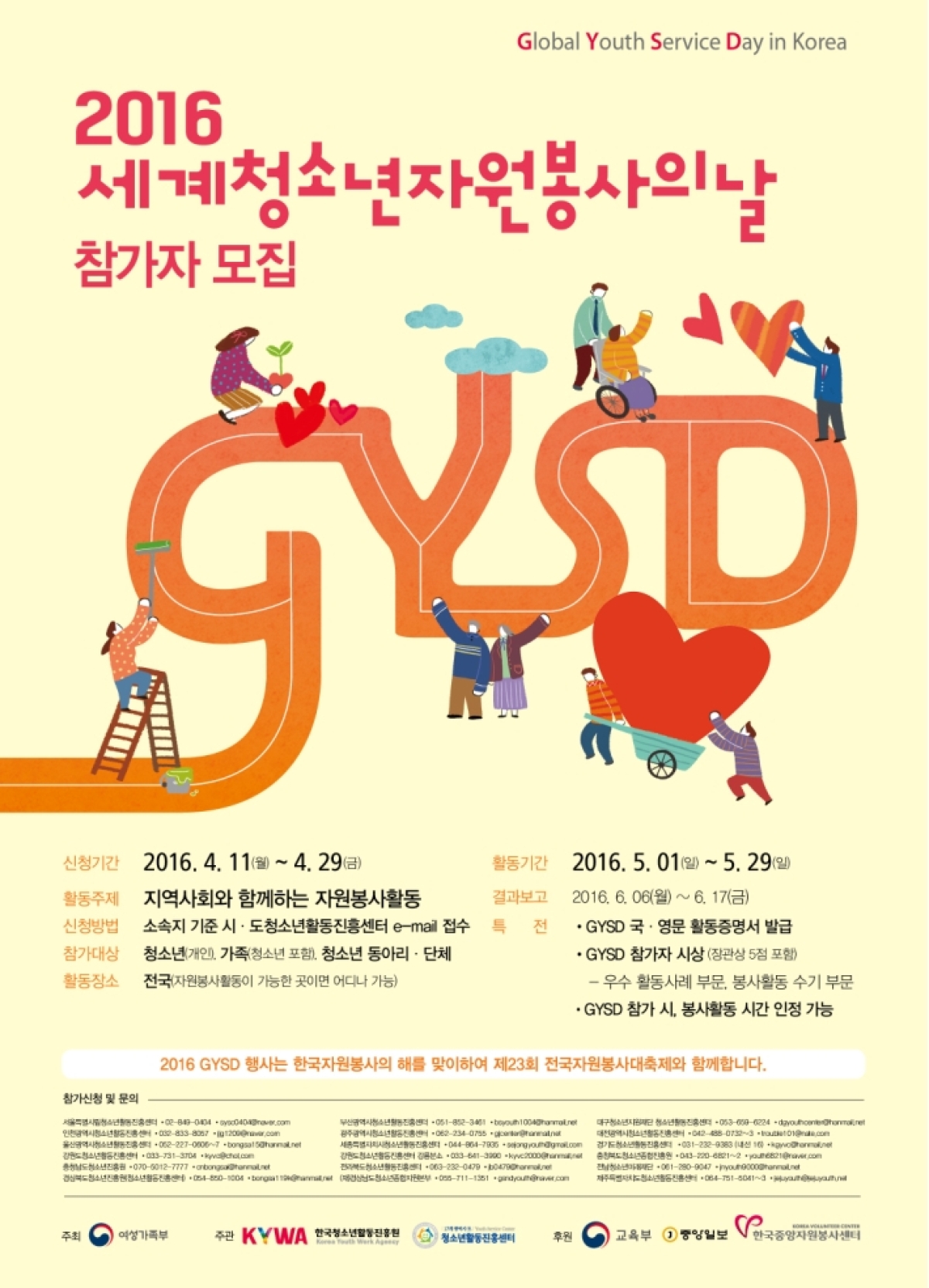 한국중앙자원봉사센터 협력기관인 한국청소년활동진흥원에서 2016 세계청소년자원봉사의날(GYSD)을 기념하여 청소년의 자기주도적 자원봉사활동을 전국적으로 개최한다고 합니다. 청소년들이 지역사회 발전을 위해 봉사활동에 참여하고 실천하는 것을 목적으로 아래와 같이 참가자를 모집 할 예정이오니 관심있는 청소년들의 많은 신청 바랍니다.