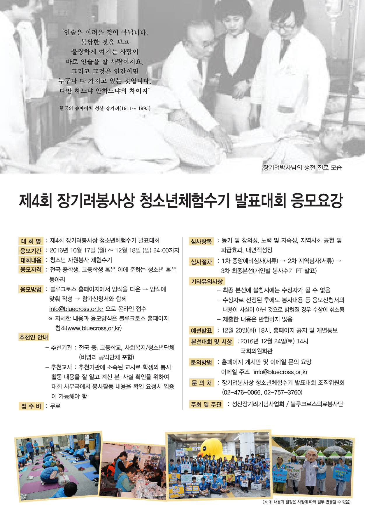 정보공유 [안내] 제4회 장기려봉사상 청소년체험수기 발표대회 안내 관리자 2016.12.09 5278 * 자세한 내용과 응모양식은 홈페이지(http://www.bluecross.or.kr/) 을 참고하시기 바랍니다. 이전글 [홍보] 라이나전성기재단 지원사업 공모 신청안내 목록 다음글 [홍보] 자원봉사센터의 기업 자원봉사 전문가 양성과정 '기업 자원봉사 리더스쿨' 참가자 모집