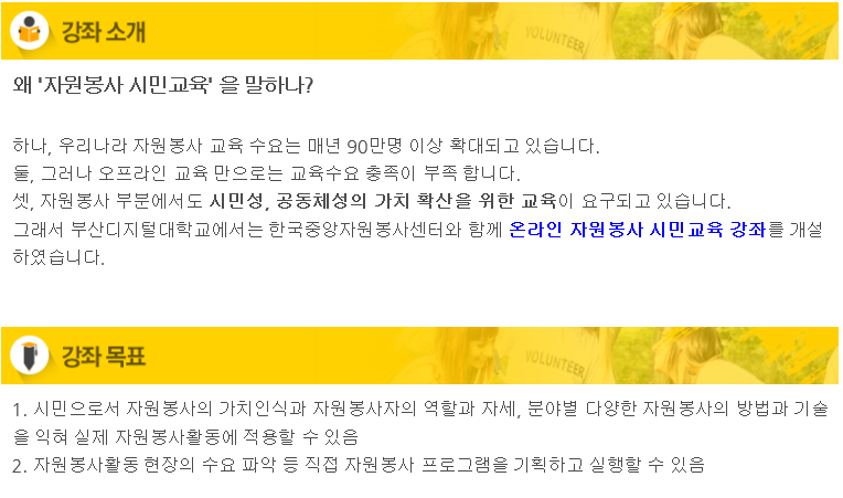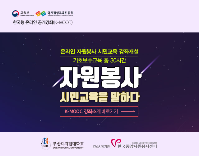 정보공유 [홍보] 온라인 자원봉사 시민교육 강좌 개설 안내 관리자 2019.07.15 2275 한국중앙자원봉사센터는 부신디지털대학교와 함께 온라인 자원봉사 시민교육 강좌를 개설하고 있습니다. 2019. 7. 1부터 진행되는 본 강좌에 수강을 희망하시는 분들은 이곳을 클릭하여 세부사항을 안내 받으시기 바랍니다. 이전글 [홍보] 2019 한국형 온라인 공개강좌(K-MOOC) ‘자원봉사 시민교육을 말하다’ 목록 다음글 [홍보] 우리 동네 환경개선 프로젝트 'HUG STREET' 참가 안내
