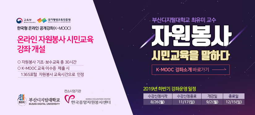 정보공유 [홍보] 2019 한국형 온라인 공개강좌(K-MOOC) ‘자원봉사 시민교육을 말하다’ 관리자 2019.09.03 2602 한국중앙자원봉사센터에서는 부산디지털대학교 공동사업의 일환으로 한국형 온라인 공개강좌(K-MOOC)‘자원봉사 시민교육을 말하다’를 추진하고 있습니다. 강좌에 대한 교육일정과 리플렛을 다음과 같이 안내드리오니 참고 부탁드립니다. 붙임. 2019 자원봉사 시민교육을 말하다 홍보 리플렛 이전글 [홍보] 위아자 나눔장터 2019 자원봉사자 모집 목록 다음글 [홍보] 온라인 자원봉사 시민교육 강좌 개설 안내
