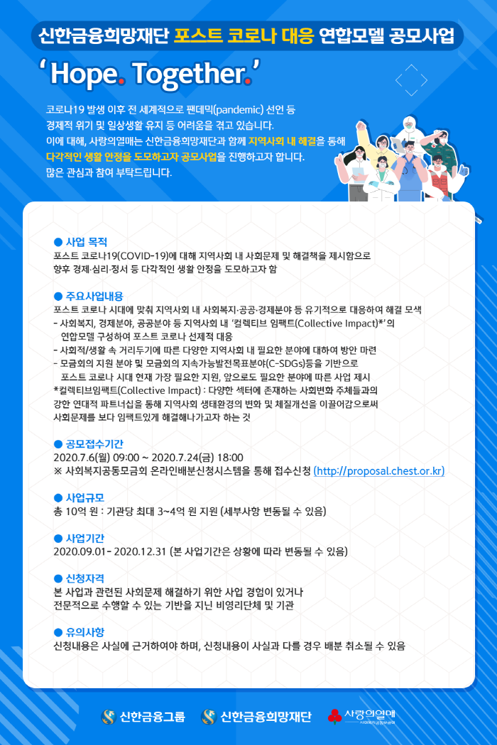 정보공유 [홍보] 2020 신한금융희망재단 지역사회 포스트코로나 대응 'Hope Together' 공모 사업 관리자 2020.07.08 1710 이전글 [홍보] 해피무브 - 내가 만드는 봉사 FLEX 목록 다음글 [홍보] 2020년 사회복지자원봉사 따뜻한 영상(자유, 프로그램) 및 이야기 공모전