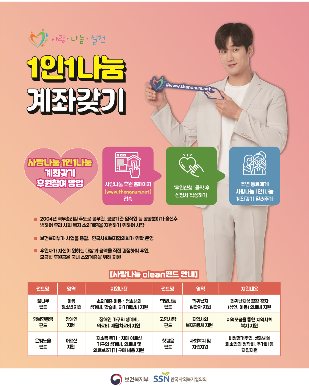 정보공유 [홍보] 사랑나눔 실천을 위한 1인 1나눔 계좌갖기 관리자 2021.03.31 1746 이전글 [홍보] 제23회 전국중고생자원봉사대회 응모 접수 목록 다음글 [홍보] 제6회 대한민국 농촌재능나눔대 대상 수상자 모집