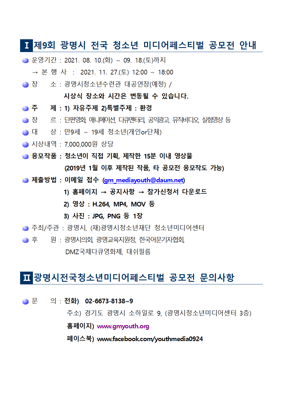 정보공유 [안내] 2021 광명시 전국청소년미디어페스티벌 참여 안내 관리자 2021.08.11 1677 이전글 [홍보] 제12회 태평양공익인권상 수상후보 추천 목록 다음글 [홍보] 함께해요 헌혈동참 캠페인