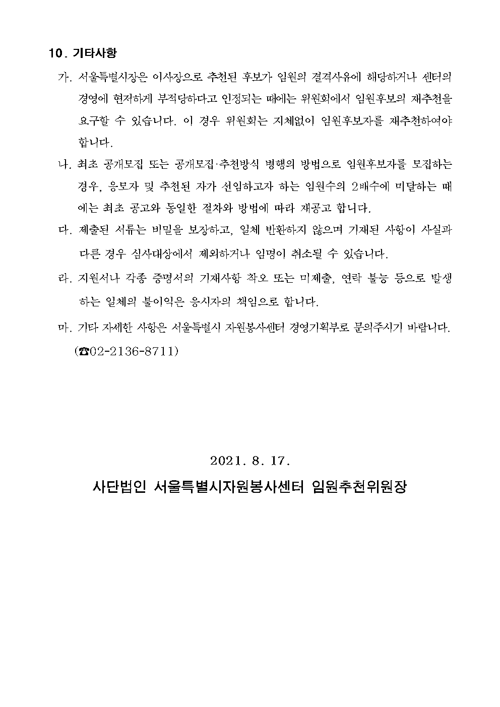정보공유 [홍보] (사)서울특별시자원봉사센터 이사장 선임 공고 관리자 2021.08.17 1756 이전글 [홍보] 2021 전국생활체육대축전 자원봉사자 모집 목록 다음글 [홍보] 제12회 태평양공익인권상 수상후보 추천