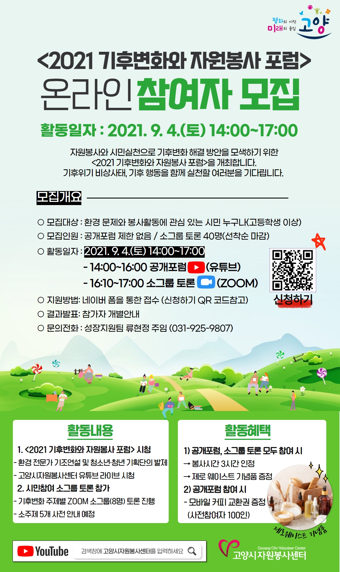 정보공유 [홍보] 2021 고양시 기후변화와 자원봉사 포럼 개최 관리자 2021.08.30 1648 이전글 [홍보] 41기 월드프렌즈 청년봉사단 전문기관 프로그램 공모 목록 다음글 [홍보] 2021 새산새숲 평화의 숲살리깅(플로깅) 참가신청 안내
