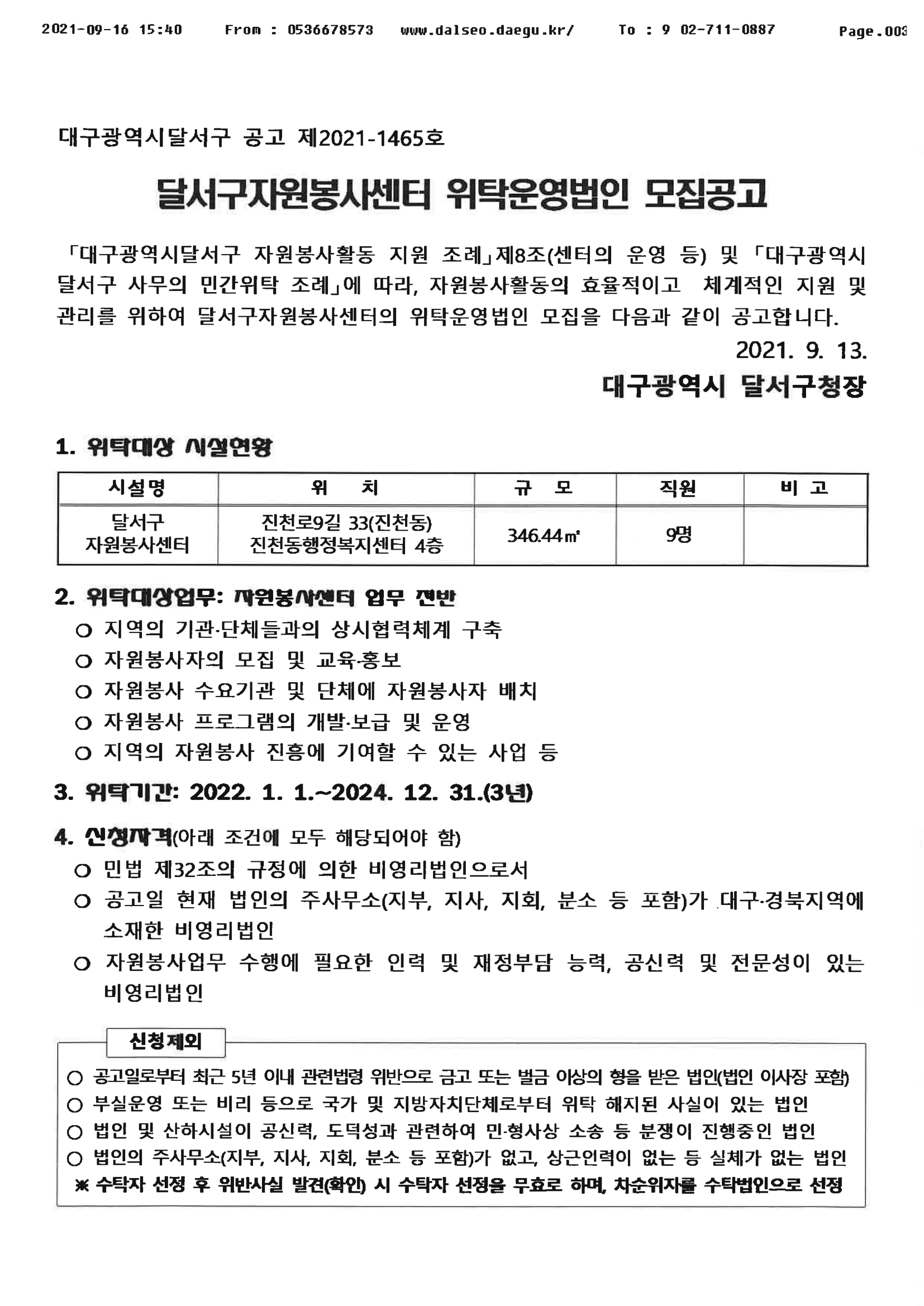 정보공유 (공고_홍보) 달서구자원봉사센터 위탁운영법인 모집 관리자 2021.09.17 1727 이전글 [홍보] 고향사랑 사회복지의 날 기념 연합 나눔캠페인 목록 다음글 [홍보] 41기 월드프렌즈 청년봉사단 전문기관 프로그램 공모