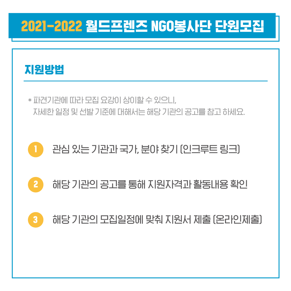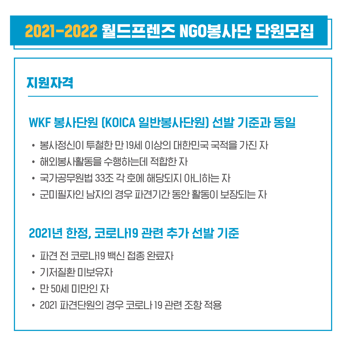 정보공유 [홍보] KCOC 월드프렌즈 NGO 봉사단 단원모집 관리자 2021.11.11 1568 이전글 [홍보] 2021 연말연시 따듯한 사랑 나눔 실천하기 목록 다음글 [홍보] 2021년 국립중앙의료원 갑질예방 및 청렴 아이디어 공모전