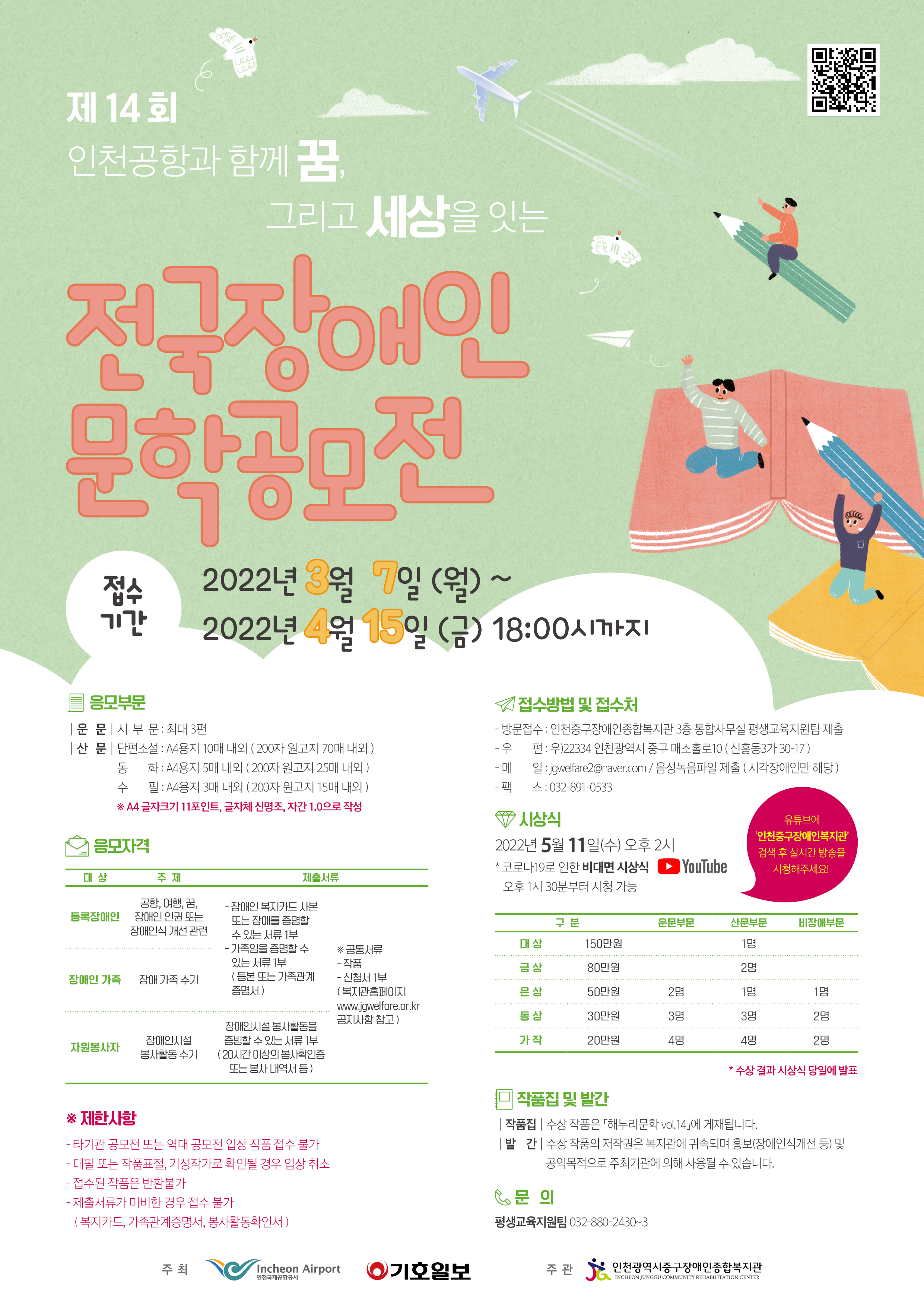 정보공유 [홍보] 제14회 전국 장애인 문학 공모전 안내 관리자 2022.03.08 1501 이전글 [홍보] 제16회 사회복지사의 날 기념식 이벤트 카드뉴스 목록 다음글 [모집] 2022년도 한강공원 자원봉사자 모집 안내