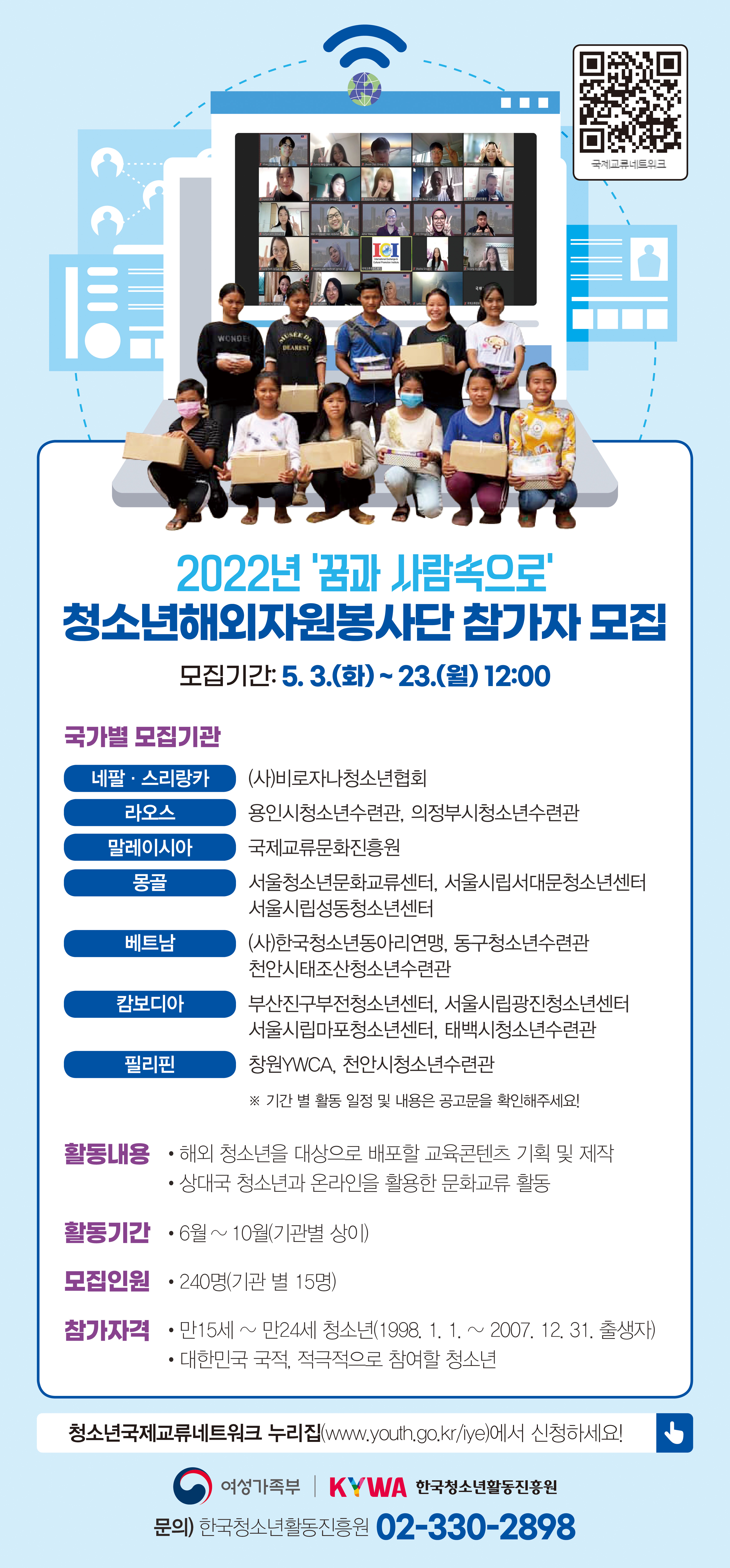 정보공유 [모집] 2022년 ‘꿈과 사람속으로’ 청소년해외자원봉사단 참가자 모집 안내 관리자 2022.05.19 1300 이전글 [홍보] 2022 한국자원봉사학회 전기학술대회 목록 다음글 [홍보] 2022 청소년 사이버폭력 예방교육 사업 "푸른코끼리" 지지크루(동아리) 모집 안내