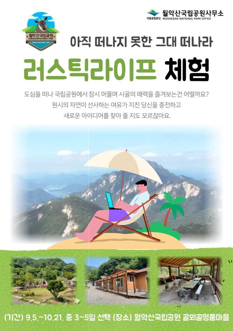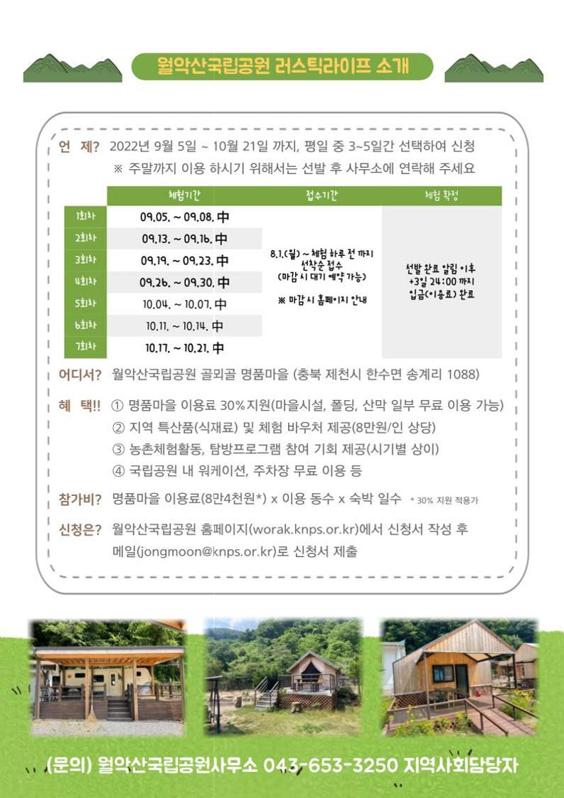 정보공유 [홍보] 월악산국립공원사무소 러스틱라이프 체험 안내 관리자 2022.08.19 1296 이전글 [홍보] 제3회 푸코와 함께하는 사이버폭력 예방 아이디어 공모전 안내 목록 다음글 [홍보] 제3회 푸코와 함께하는 사이버폭력예방 아이디어 공모전