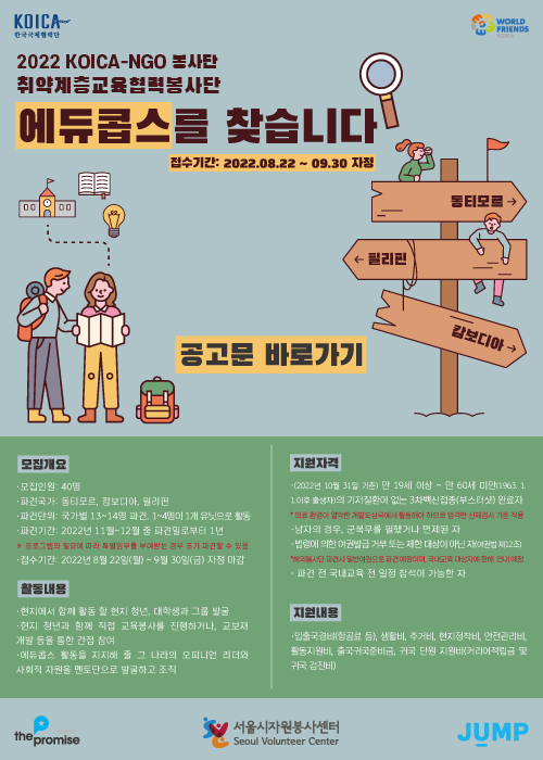 정보공유 [홍보] 글로벌 '교육협력봉사단 Edu_Corps' 모집 안내 관리자 2022.09.15 1394 이전글 [홍보] 자원봉사V 써니데이즈 댄스챌린지 참여하고 푸짐한 상품 GET 하자! 목록 다음글 [홍보] 「추석맞이 소외계층을 위한 1인 1나눔 캠페인」