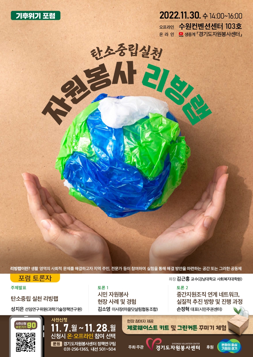 정보공유 [홍보] 2022 탄소중립 실천 ‘자원봉사 리빙랩’ 포럼 안내 관리자 2022.11.18 1449 이전글 [홍보] 심리 안전화 문화 보급을 위한 「해말게(해주세요! 따뜻한 말을 재난을 당한 모든 사람들에게) 챌린지」 안내 목록 다음글 [모집] 2022 제10회 희망더하기 자선 야구대회 안전 자원봉사자 모집