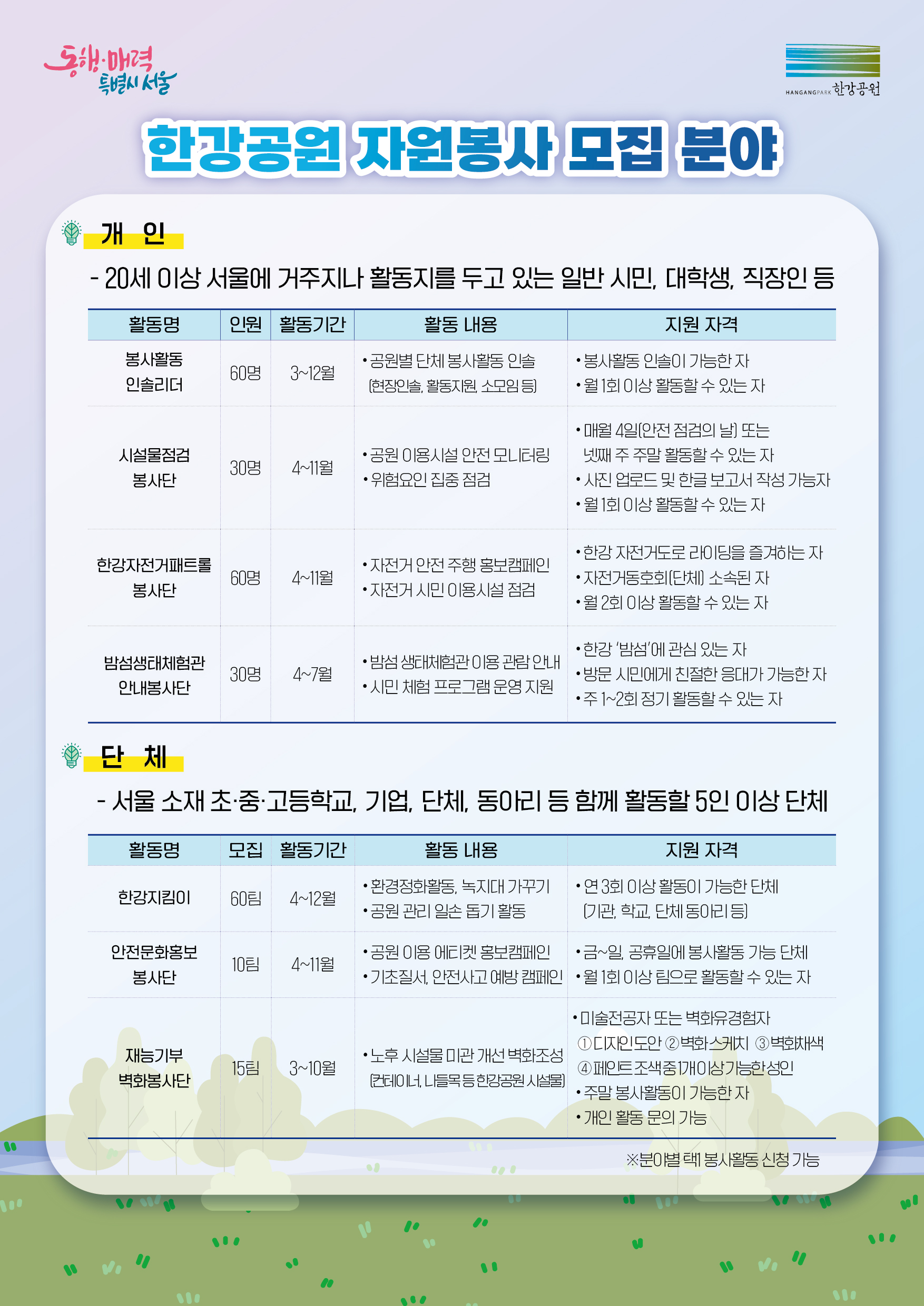 정보공유 [모집] 2023 한강공원 자원봉사자 모집 관리자 2023.02.24 1364 이전글 [홍보] 강원세계산림엑스포 안내 목록 다음글 [홍보] 제8회 대한민국 농촌재능나눔 대상 안내