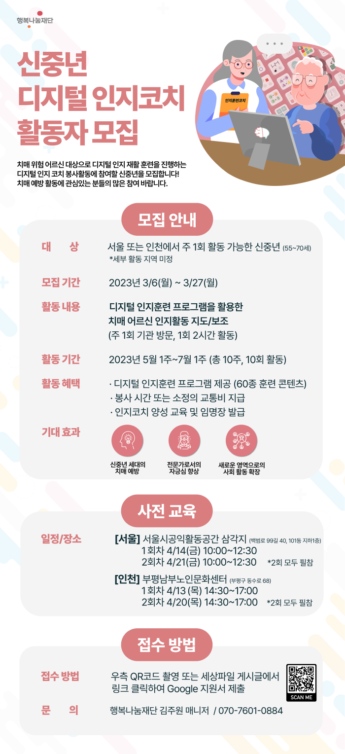 세상파일 신중년 사회공헌 활동'디지털 인지코치' 프로젝트에 참여할 신중년(5060) 활동자를 모집합니다.