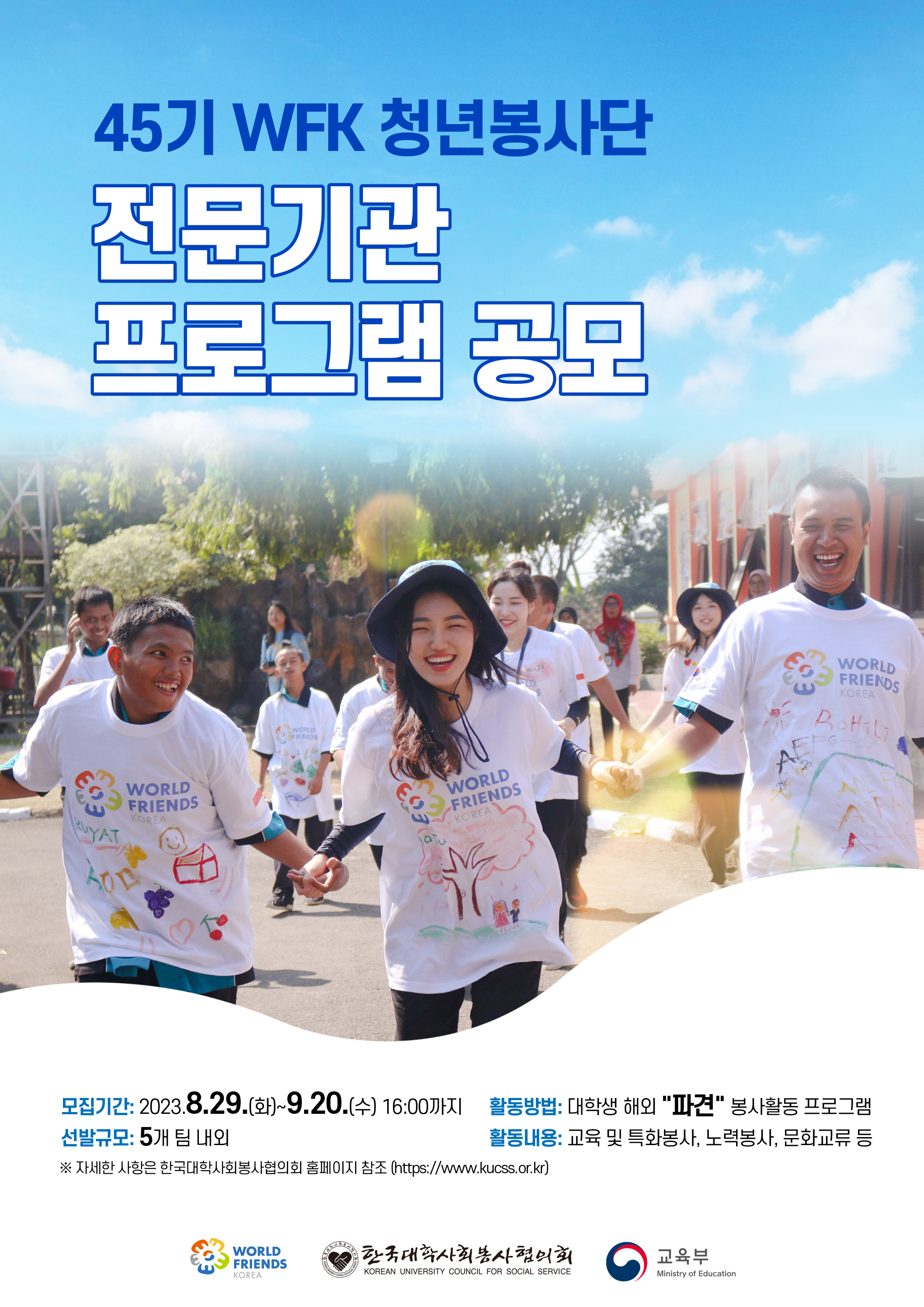 정보공유 [홍보] 한국대학사회봉사협의회 45기 월드프렌즈코리아 청년봉사단 전문기관 프로그램 공모 안내 관리자 2023.08.30 1436 이전글 [공유] '재난 현장 속 자원봉사자'를 찾습니다. -2- │ [한정덕 님] – 조금 더 괜찮은 사람이 되어가는 중입니다 목록 다음글 [공유] '재난 현장 속 자원봉사자'를 찾습니다. -1- │ [박지용 님] – 봉사, 내 삶이 바뀌는 터닝 포인트