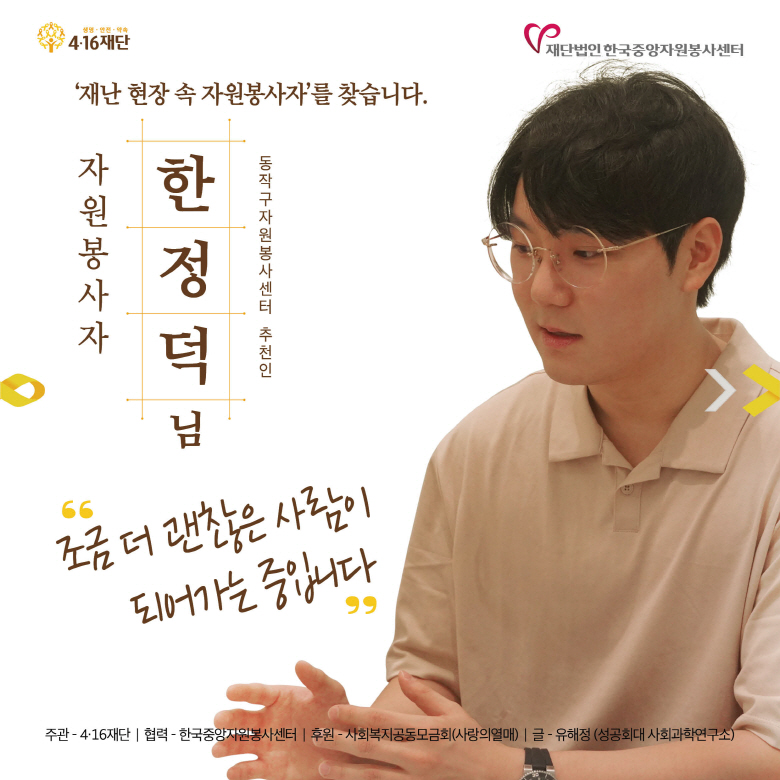 [공유] '재난 현장 속 자원봉사자'를 찾습니다. -2- │ [한정덕 님] – 조금 더 괜찮은 사람이 되어가는 중입니다