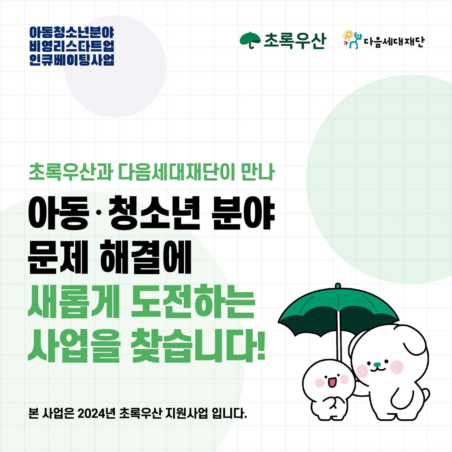 정보공유 [홍보] 2024 초록우산X다음세대재단 '아동・청소년 비영리스타트업 인큐베이팅 사업' 공고 관리자 2024.03.04 1271 이전글 [홍보] 2024년 WFK 청년봉사단 전문기관 프로그램 공모 목록 다음글 [홍보] 「2024 김해올래! 김해 볼런투어」 참가 신청(선착순 모집)
