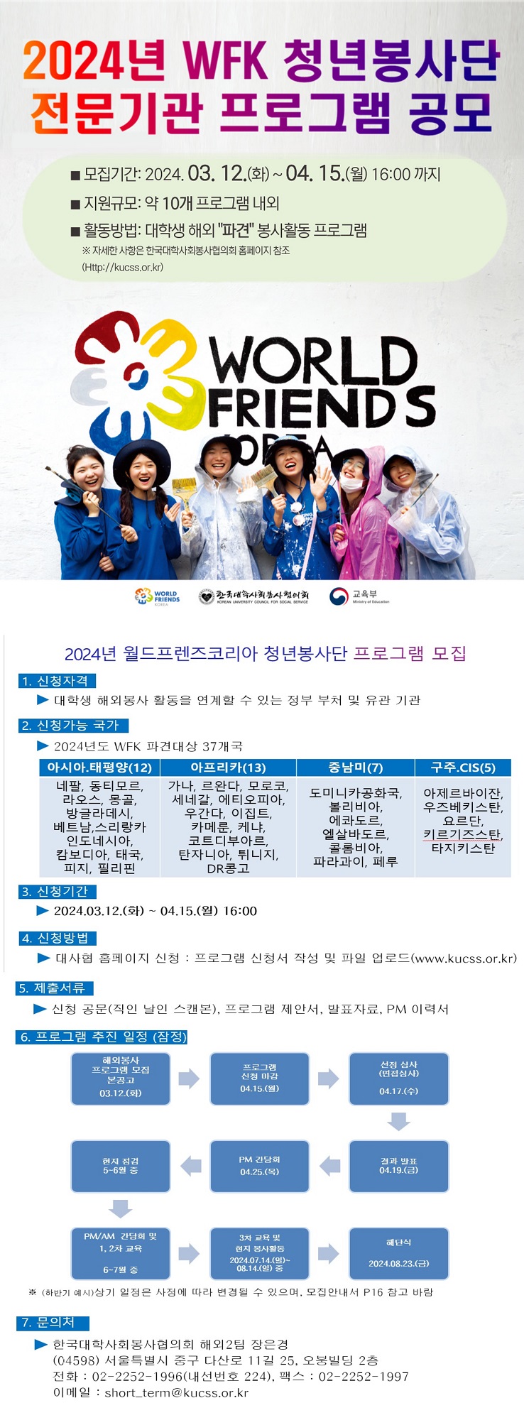 정보공유 [홍보] 2024년 WFK 청년봉사단 전문기관 프로그램 공모 관리자 2024.03.12 1259 이전글 [홍보] 2024년 「제48회 청백봉사상」 공모 목록 다음글 [홍보] 2024 초록우산X다음세대재단 '아동・청소년 비영리스타트업 인큐베이팅 사업' 공고