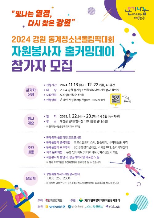 강원특별자치도와 강원특별자치도자원봉사센터는“2024 강원 동계청소년올림픽대회”1주년을 맞아 올림픽의 추억과 감동을 재현하고, 자원봉사 레거시 재확산을 위한 「2024 강원 동계청소년올림픽대회 자원봉사자 홈커밍대회」행사를 다음과 같이 개최합니다. 여러분의 많은 관심과 참여 바랍니다.