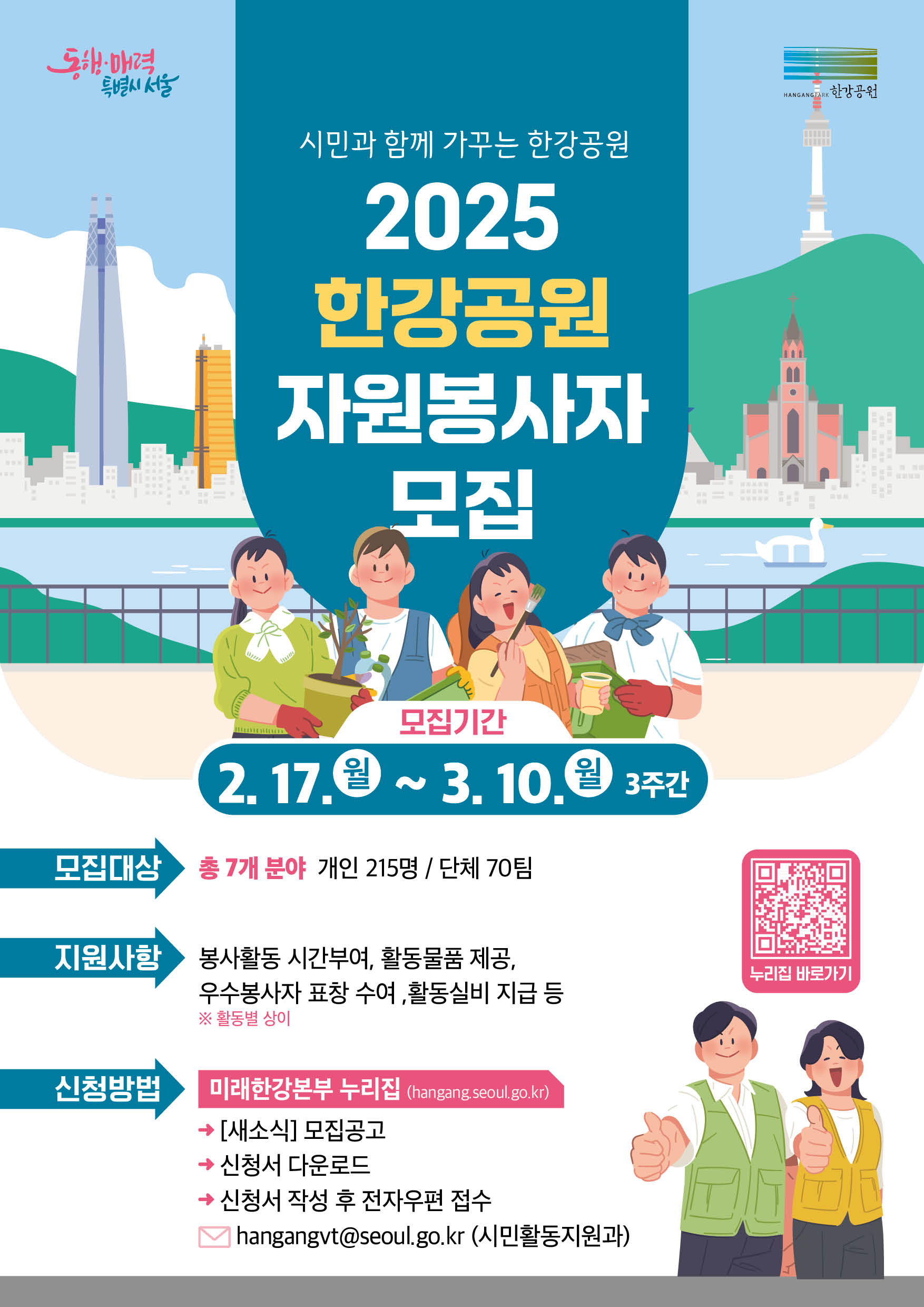 서울특별시 미래한강본부에서는 시민참여 한강공원 관리를 위해 2025년도 한강공원 자원봉사활동에 참여할 개인 및 단체를 모집하고 있으니, 많은 관심과 참여 부탁드립니다.