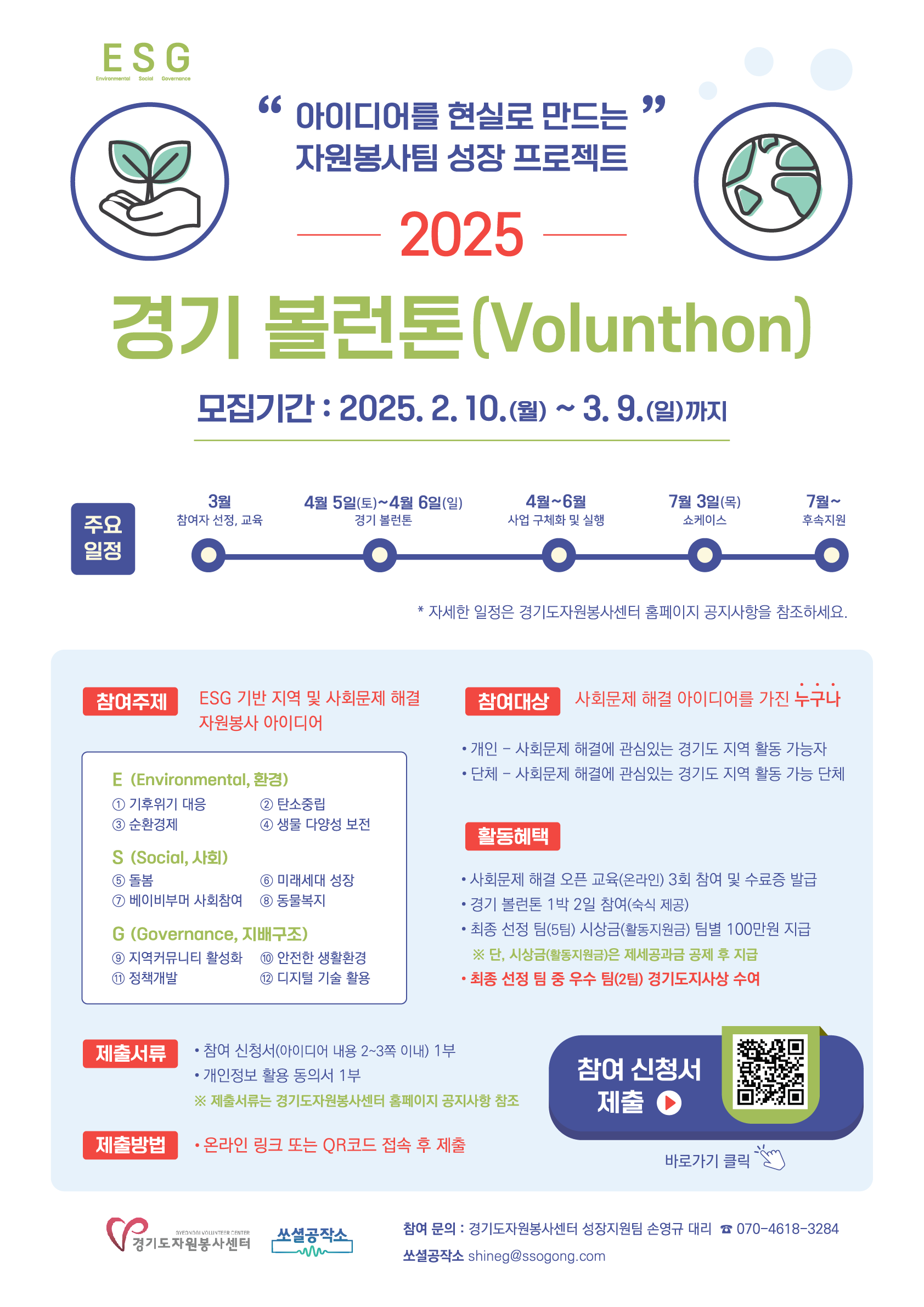 ○ 모집기간 : 2025. 2. 10.(월) ~ 3. 9.(일)까지 ○ 제출서류 * 경기도자원봉사센터 홈페이지 공지사항 참조- 참여 신청서(아이디어 내용 2~3쪽 이내) 1부- 개인정보 활용 동의서 1부