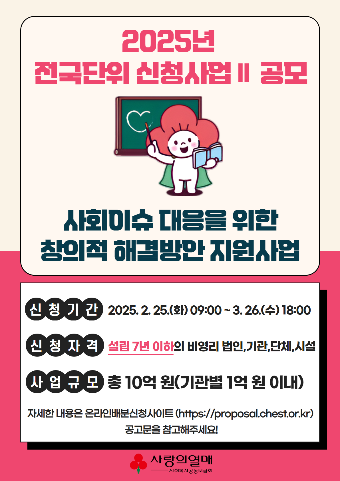사회복지공동모금회에서는 2025년 전국단위 신청사업ll '사회이슈 대응을 위한 창의적 해결방안 지원사업'을 붙임과 같이 시행하오니 많은 관심 부탁드립니다.