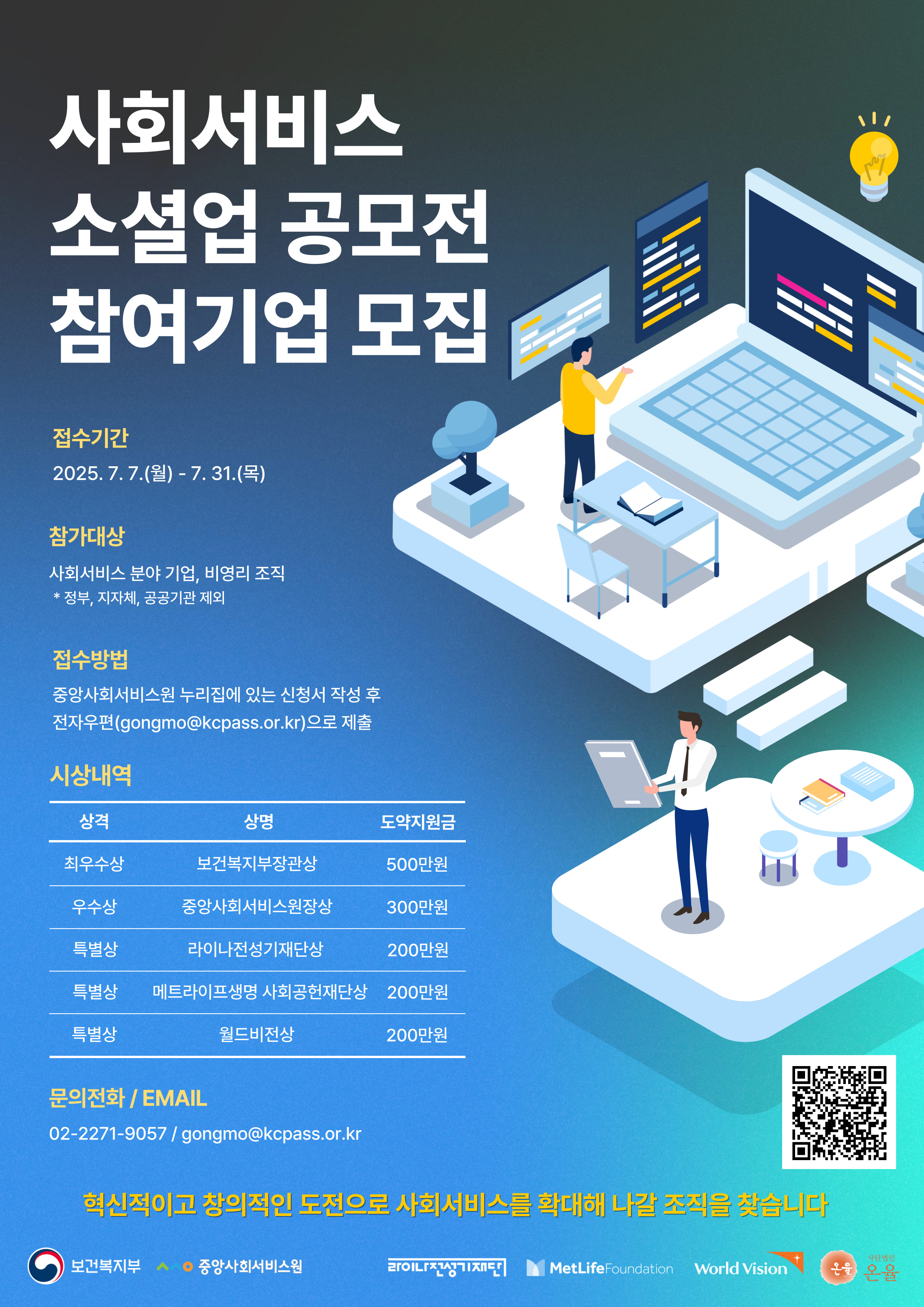 정보공유 [홍보] 2025년 사회서비스 소셜업 공모전 참여기업 모집 안내 관리자 2025.07.15 183 이전글 [홍보] 제3차 황당규제 공모전 온라인투표 안내 목록 다음글 [홍보] 사회복지공동모금회, 2026년 전국단위 신청사업 안내