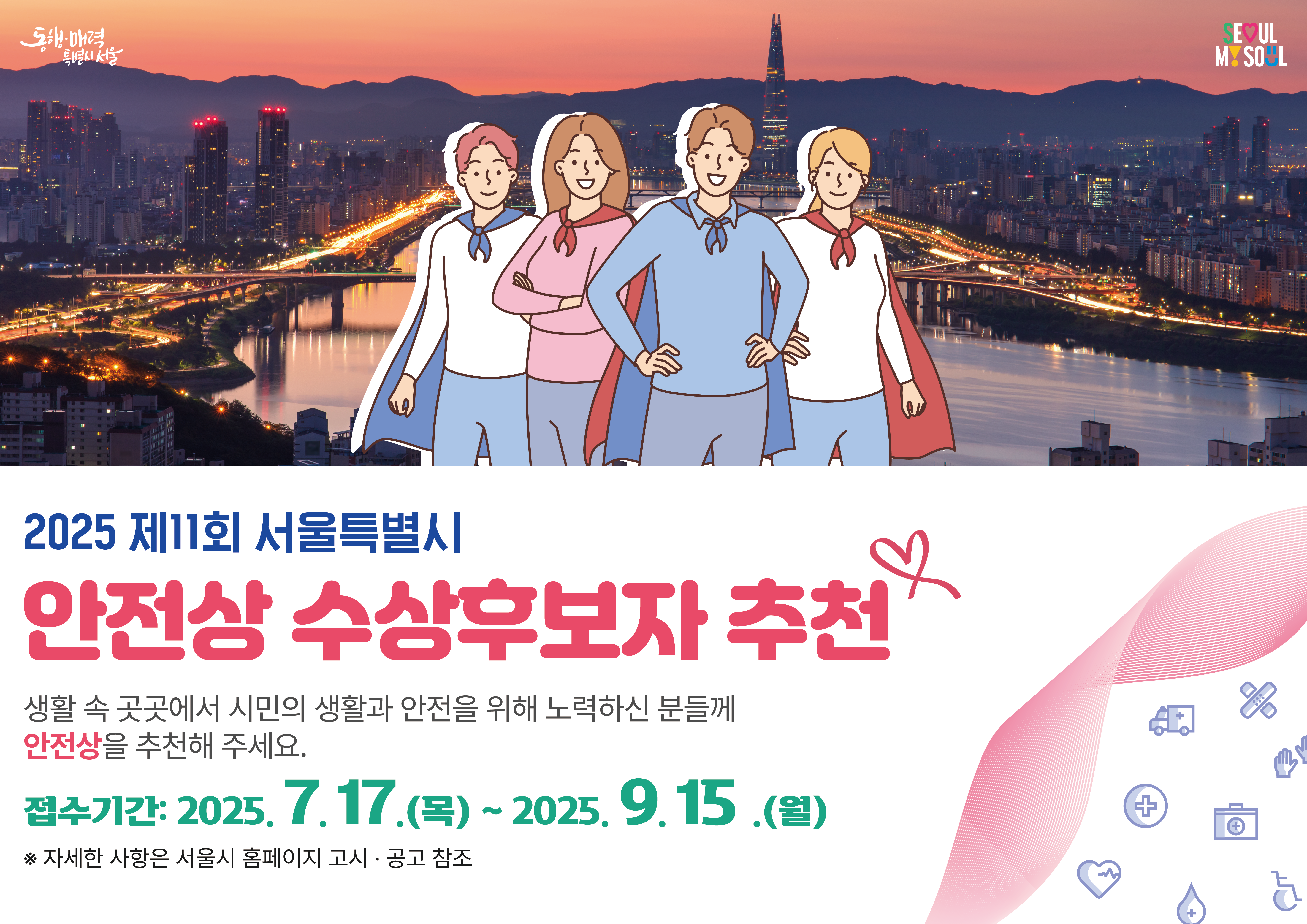 정보공유 [홍보] 2025년 제11회 서울특별시 안전상 수상후보자 추천 안내 관리자 2025.07.22 181 이전글 [홍보] 2025년 올해의 여성과학기술인상 후보자 추천 안내 목록 다음글 [홍보] 제16회 태평양공익인권상 수상 후보 추천 안내