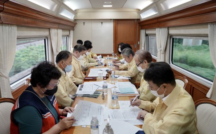 청와대에 따르면 KTX 열차 내 회의실에서 산림청장, 농림부 차관 재난안전관리본부장, 보건연구원장, 대한적십자사 본부장, 한국중앙자원봉사센터장 등