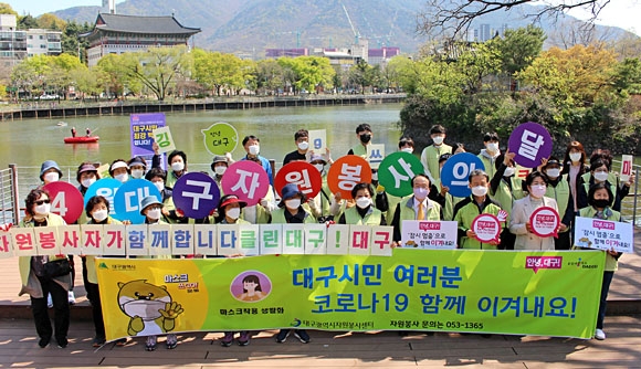 ▲ 정영애(앞줄 오른쪽 다섯 번째) 대구자원봉사포럼 회장과 대구광역시자원봉사센터 자원봉사자들, 관계자 등이 ‘환경정화 플로깅(줍깅) 캠페인’ 활동을 한 뒤 기념촬영을 하고 있다. 한국중앙자원봉사센터 제공