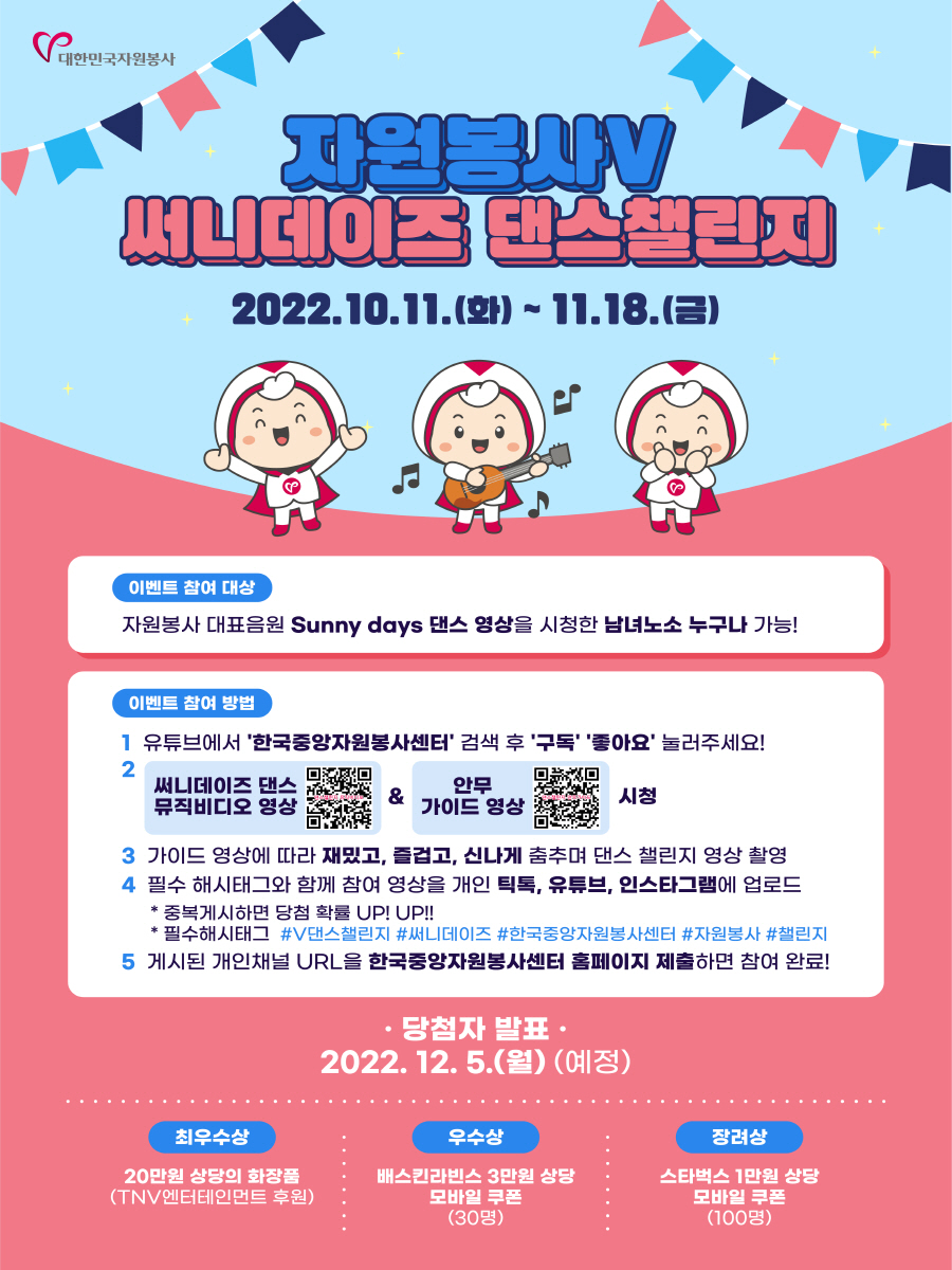 이번 댄스챌린지는 대한민국 자원봉사 대표 음원인 Sunny days (가수 정유진)의 댄스 뮤직비디오와 안무가이드 영상의 안무를 따라 춘 영상을 촬영해 개인 SNS에 업로드하면 참여할 수 있다.