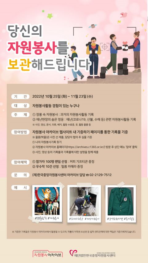 한국중앙자원봉사센터(이하 센터)가 ‘자원봉사 아카이브 기록수집 이벤트’를 다음 달 23일까지 연다고 26일 밝혔다. 이번 이벤트는 자원봉사자들이 현장에서 기록한 사진·영상·문서 등을 모아 공공의 유산으로 보존하기 위해 마련됐다.