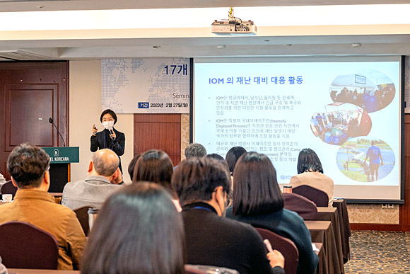 ▲ 김지은 국제이주기구(IOM)의 팀장이 ‘재난 대응의 국제적 기준과 주요 아젠다’에 대해 강의하고 있다. 한국중앙자원봉사센터 제공