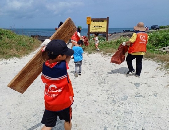 ▲ 2022산해진미축제에서 어린이 참가자가 제주 해안가 플로깅에 참여하고 있다. 한국중앙자원봉사센터
