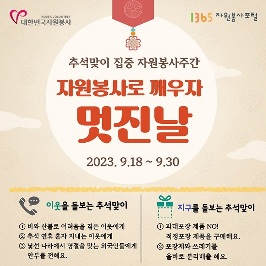 두 번째로는 ‘추석 환경 보호 실천 캠페인이 진행된다’ 명절 선물이나 제수용품의 과대포장을 근절하고 적정포장 제품을 선택해 구입하거나, 명절에 많이 발생하는 스트로폼, 플라스틱 용기, 아이스팩, 부직포 가방 등 다양한 명절 쓰레기를 올바른 방법으로 분리배출을 실천해 탄소중립 사회로 발돋움을 위한 추석 환경보호 실천 캠페인도 진행된다. 추석맞이 집중 자원봉사 주간 자원봉사 캠페인은 추석 연휴 기간(9월 30일까지)에 캠페인 내용에 맞는 자원봉사활동을 실천하고 후기를 남기면 참여할 수 있다.