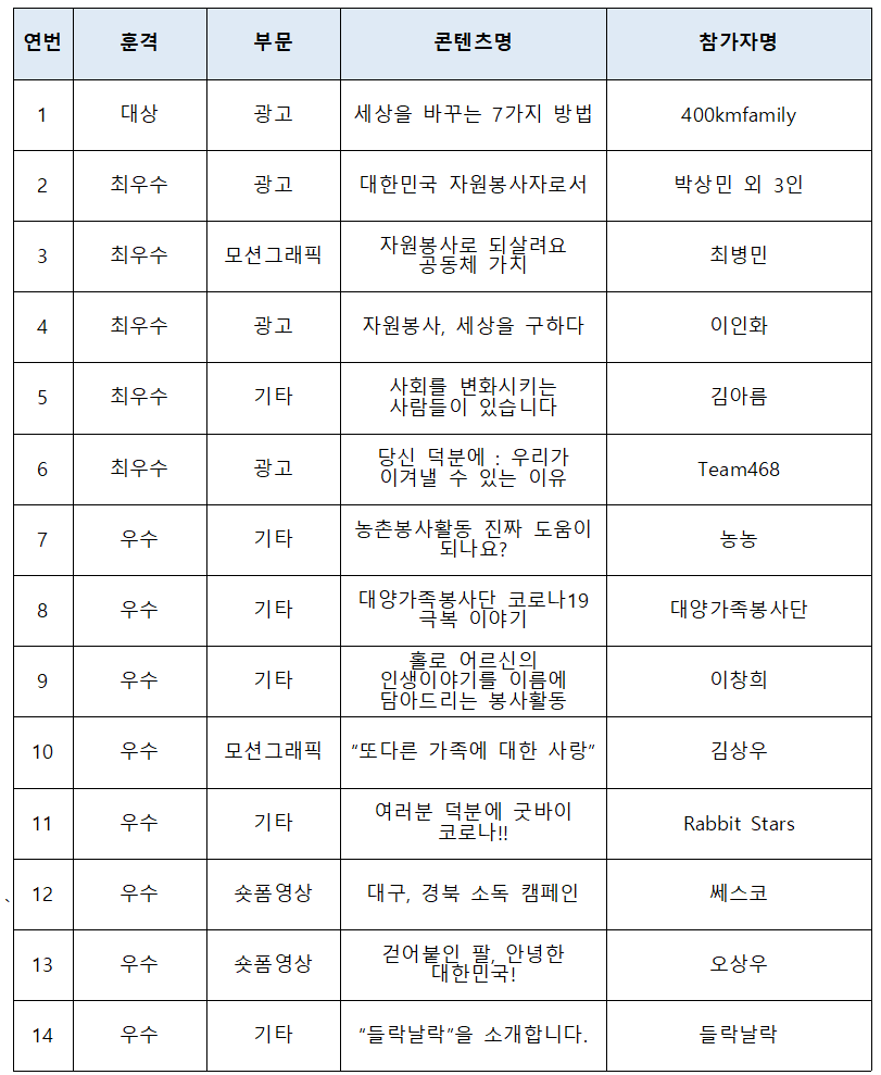 (공고 제 2020-17호) 2020 우수 자원봉사 홍보콘텐츠 공모전 선정 결과공고