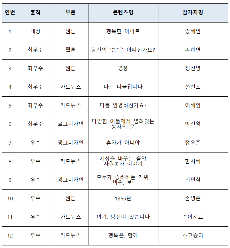 아래와 같이 선정 결과를 안내합니다. 공모전에 출품해주신 참가자 분들의 관심과 지원에 깊은 감사를 드립니다.