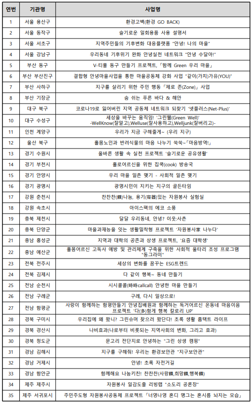 아래와 같이 선정 결과를 안내합니다. 공모사업에 적극 참여해주신 전국 자원봉사센터 관계자의 관심과 지원에 깊은 감사를 드립니다.