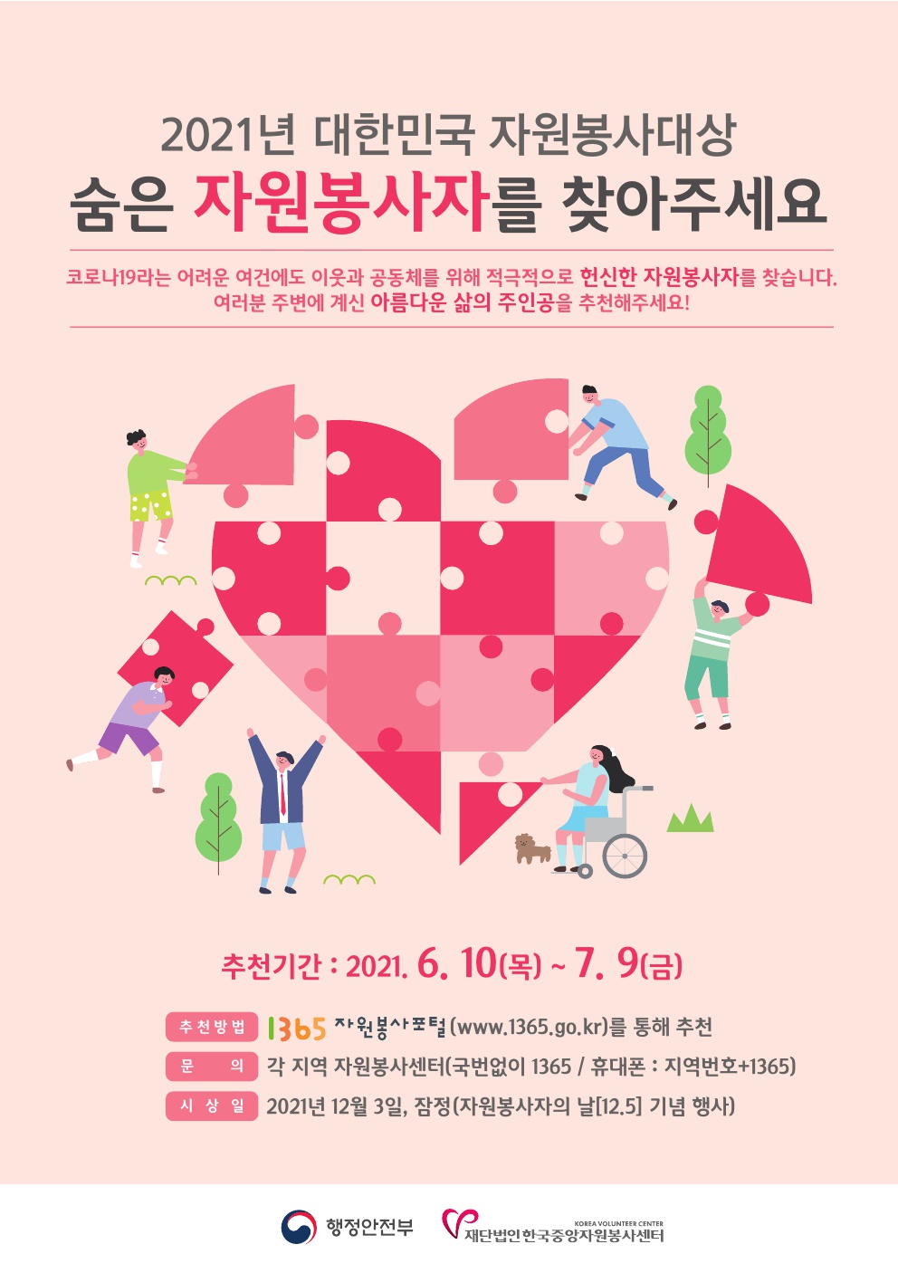 공지사항 [안내] 2021년 대한민국 자원봉사대상 국민추천 후보자 모집 2021.06.10 관리자 붙임1. 2021년 대한민국 자원봉사대상 추진계획.hwp 이전글 이그나이트 V-Korea 우수사례 1차 서류 심사 우수사례선정 결과입니다. 목록 다음글 (공고 제2021-010호) 2021 청년 주도형 안녕캠페인 공모사업 선정결과 공고