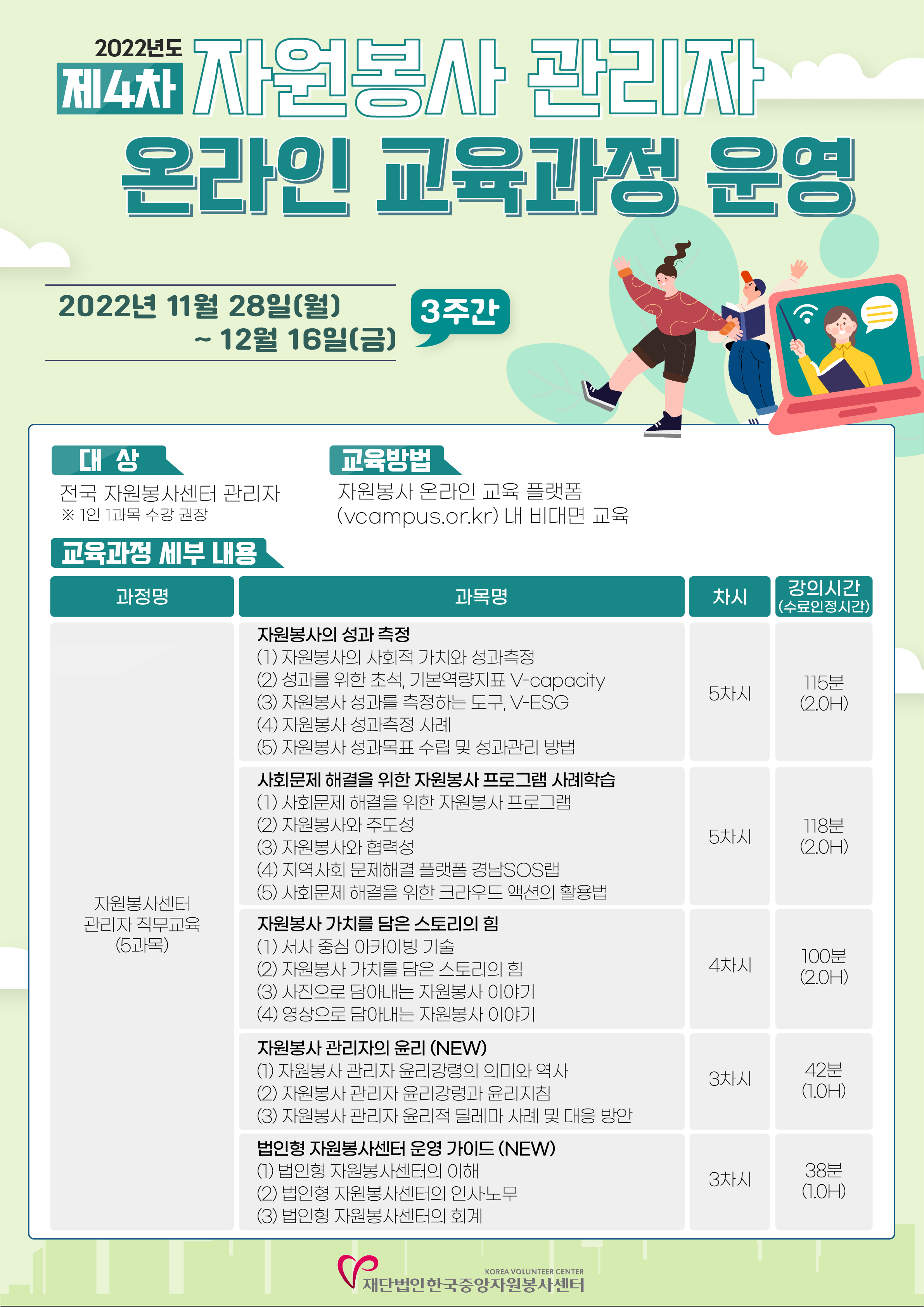 공지사항 [공지] 2022년도 제4차 자원봉사 관리자 온라인 교육과정 운영 안내 2022.11.25 관리자 이전글 [공지] 제17회 자원봉사자의 날 기념 2022 전국자원봉사자대회 안내 목록 다음글 [선정공고] 대한민국 플로깅 코스 공모전