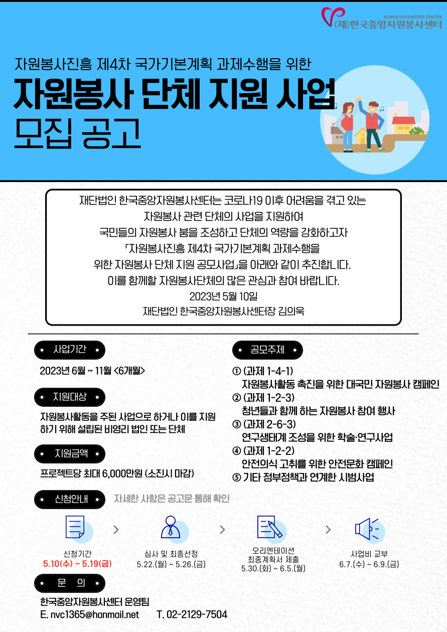 공지사항 [공지] 자원봉사진흥 제4차 국가기본계획 과제수행을 위한 자원봉사 단체 지원 공모 공고 2023.05.10 관리자 붙임1. 자원봉사 단체 지원 공모사업 공고문_최종.hwp 붙임2. 자원봉사 단체 지원 공모사업 신청 서식_최종.hwp 붙임3. 2023년 예산편성원칙 및 회계처리기준_최종.hwp 이전글 안녕캠페인 성과보고서 발간 안내 목록 다음글 [공지] 2022년 공익법인 결산서류 등의 공시_표준서식