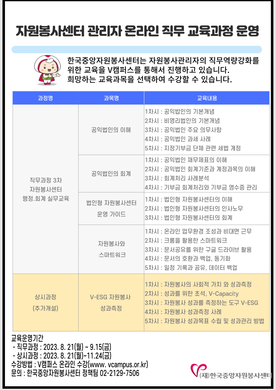 3월 20일(월)~11월 24일(금) | [상시과정] 자원봉사센터의 이해 [상시과정] 자원봉사 관리자의 윤리 [상시과정] 자원봉사와 인권 [상시과정] V-ESG 자원봉사 성과측정(추가) |