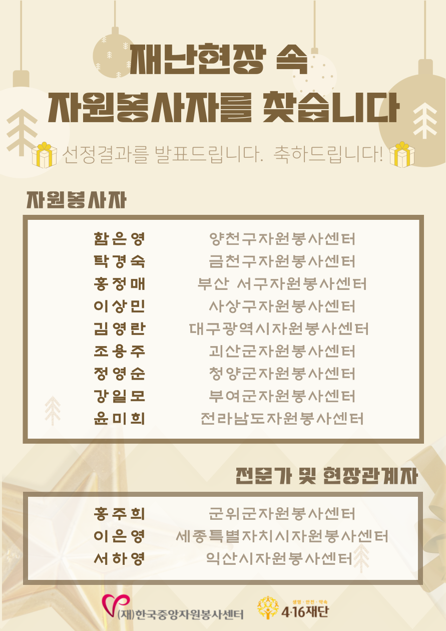 공지사항 [포상] 「'재난 현장 속 자원봉사자'를 찾습니다」 (2차) 선정 결과 2023.12.04 관리자 이전글 [선정공고] 2023 종이팩 회수·재활용 촉진 공로자 표창 목록 다음글 [당첨발표] 그린웨일 회원가입 이벤트 당첨 유저 발표